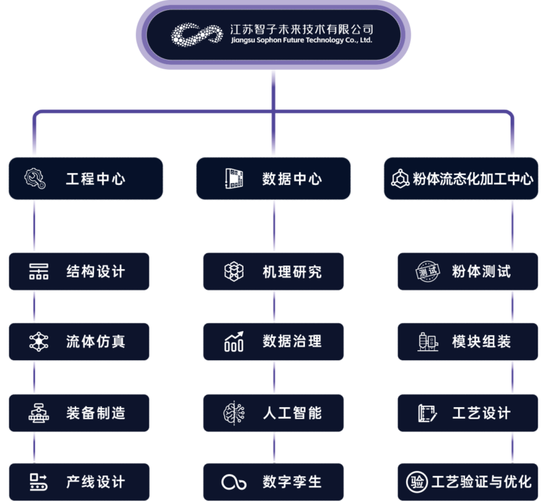 公司是广东智子智能技术有限公司(Sophon)的全资子公司。现有工程中心、数据中心和粉体流态化加工中心三大板块。在材料测试、制备、量产阶段,提供装备制造、工艺实验、产线设计搭建、工艺包等工程化和数据化解决方案。客户行业以电池材料、金属粉末、催化剂材料、陶瓷粉体、食品医药等领域为主。